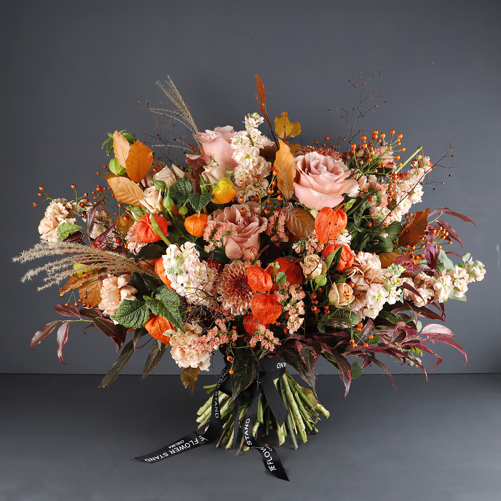 Gloriously warm colours are the focus of this beautiful bouquet. Leaves and flowers coming into season at this time of the year with all their pink, red, brown and orange hues. A true ode to Autumn!